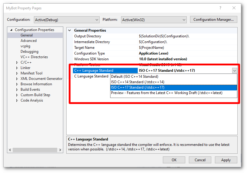 11. Go to the general section in the same window now, and look for the drop down list labelled "C++ Language Standard". If you're on VS2022, make sure the selected option is C++20 Standard (/std:c++20) or later. If you're on VS2019, make sure the selected option is C++17 Standard (/std:c++17) or later.