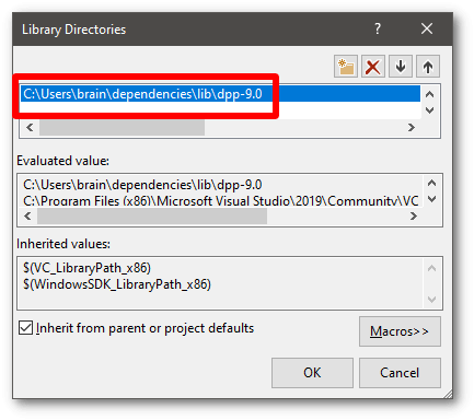 12. Again within the same window, go to the input section, under the linker category, and add 'dpp.lib;' to the start of the libraries to include, as shown below: